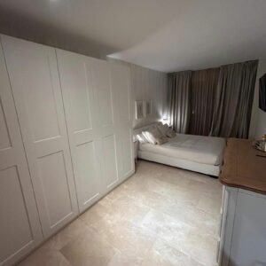 The apartment features two bedrooms, two bathrooms (both renovated with high-quality materials), and a modern fully equipped kitchen. The electric water heater is brand new, and elegant marble floors add a timeless touch of sophistication.