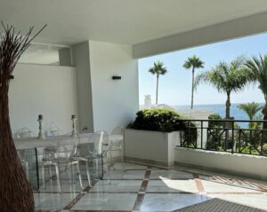 An elegant 2-bedroom, 2-bathroom apartment for sale in the prestigious beachfront development of Doncella Beach, ideally located on the first line of the sea in Estepona.