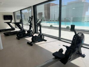 The domotic system for home automation is also installed to control the lights and electric blinds. Air conditioning and floor heating are provided though aerothermal energy. Also good to know is that the extra spacious utility room with washing and tumble dryer is just across the front door. A private underground parking space is also included in the price. The exclusive gated community offers a large outdoor pool and state of the art gym facilities, community area, game room and secure entrance.