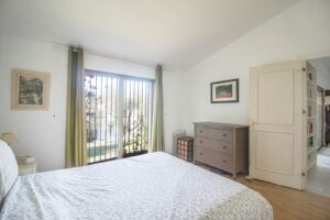 The apartment offers two spacious bedrooms, both with ensuite bathrooms, plus an additional guest bathroom for added convenience. The large open-plan living and dining area features a striking high vaulted ceiling that enhances the sense of space and light, while a wood-burning fireplace creates a warm and welcoming atmosphere — perfect for year-round comfort.