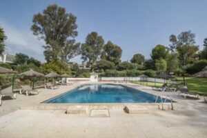 From the living room, sliding doors lead out to a covered terrace with glass curtains, providing a versatile outdoor space ideal for relaxing or entertaining in all seasons. The terrace enjoys views over the immaculately maintained communal gardens, surrounded by mature greenery and a large swimming pool that invites you to enjoy the Costa del Sol lifestyle.