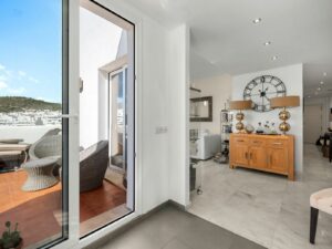 The living-dining room stands out for its spaciousness and luminosity, with direct access to a pleasant private terrace from where you can enjoy impressive panoramic views of the golf course and the sea. The kitchen is fully equipped with quality appliances, ideal for those who value both design and functionality.