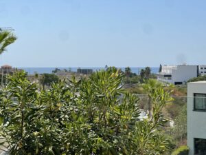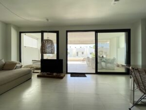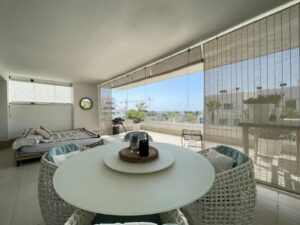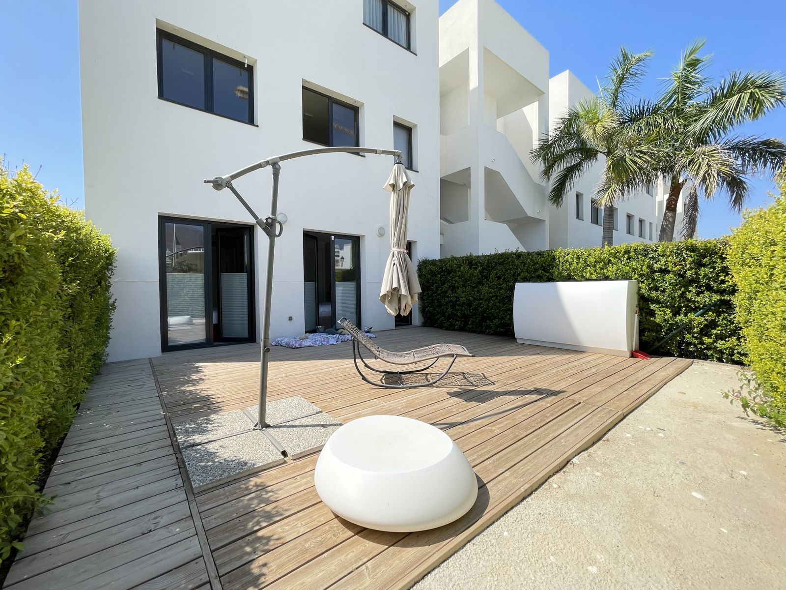 It has two bedrooms and two bathrooms, ideal for both families and couples who value space and functionality. The apartment has a 45m² private terrace and a 45m² ground floor patio, both perfect for enjoying the Mediterranean climate, the sun and the partial sea views. The property has a fully equipped open-plan kitchen, separate laundry area, air conditioning and built-in wardrobes that optimise the use of space.