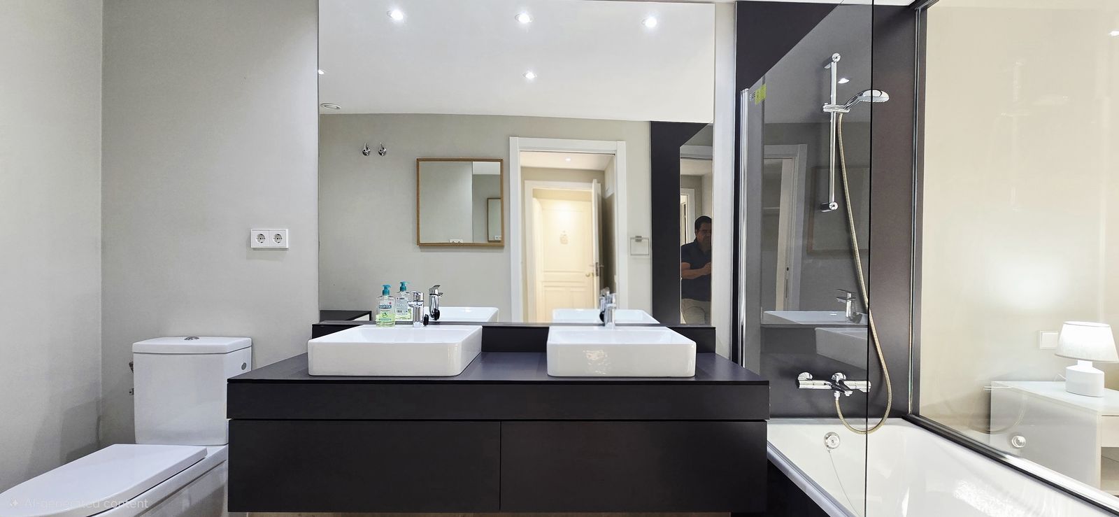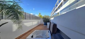 The terrace is set on two levels: the lower level features a private jacuzzi, ideal for relaxing in privacy. Both bedrooms have direct access to the terrace, filling the rooms with natural light. The guest bedroom includes fitted wardrobes, while the primary suite boasts a walk-in wardrobe and a spacious ensuite bathroom with double sinks and a bathtub. There is also a modern guest bathroom with a walk-in shower.