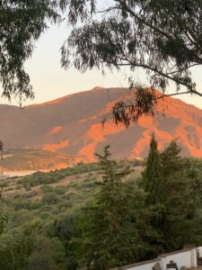 The terrace surrounds the property on the south, west, and north sides, allowing for different outdoor areas. South-facing with partial sea views, west-facing with mountain and pool views, and north-facing with mountain views. Includes parking space and storage room.