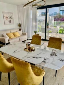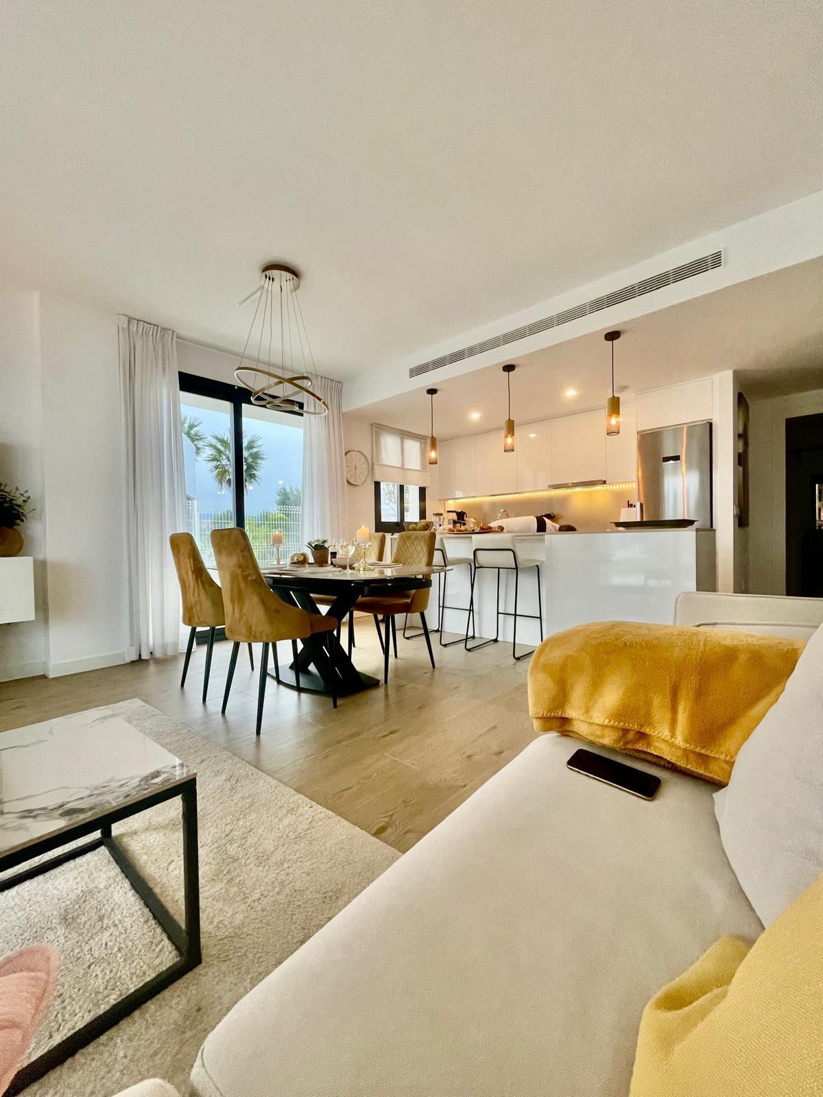 The living room leads directly to the terrace and a private south-facing patio with artificial grass and partial sea views. The bedrooms are located on the north side of the building, providing greater tranquility. The master bedroom has direct access to the terrace.