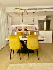 The property has two bedrooms and two bathrooms, a living room with an open-plan kitchen and a large central island. The living room and kitchen have large sliding doors facing south and west.