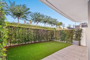 The master bedroom features its own bathroom, built-in wardrobe, and direct access to a private outdoor garden. The second bedroom also includes a built-in wardrobe and opens onto a private garden area, making both rooms feel airy and connected to nature. All the furniture throughout the apartment is of premium quality, enhancing the refined and modern atmosphere.