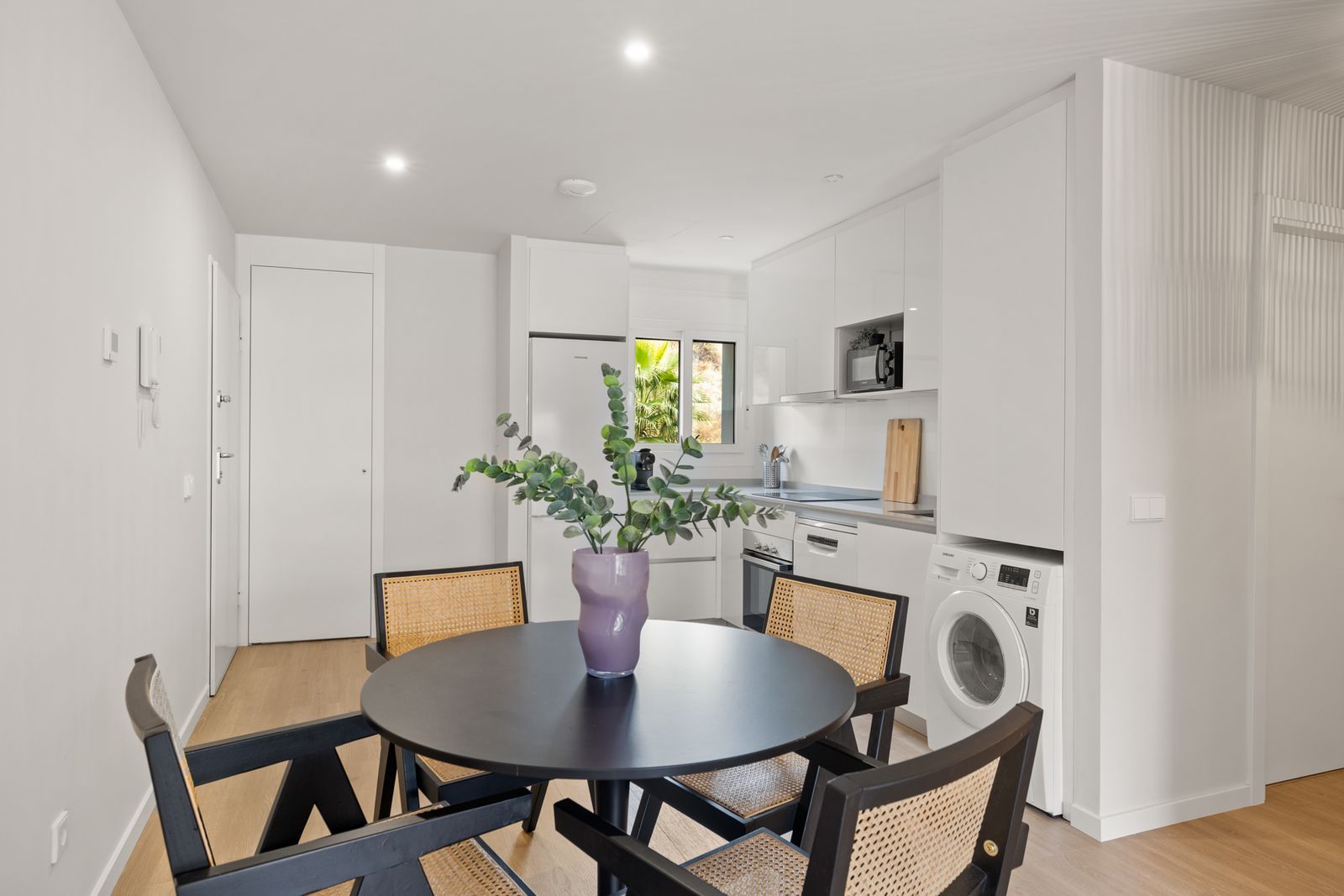 – Fully equipped open kitchen with oven, microwave, induction hob, dishwasher, fridge-freezer, toaster, blender, coffee machine, and kettle