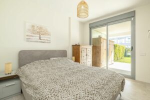 The interior is beautifully furnished and thoughtfully designed, with a modern open-plan kitchen fully equipped with high-quality appliances. The bright living area offers generous space for relaxing or entertaining and opens directly onto a private terrace and garden, providing an ideal outdoor area to enjoy the Mediterranean climate. The master bedroom features an ensuite bathroom and direct access to the garden, while the second bedroom is equally comfortable with a double bed and ample wardrobe space. Centralised air conditioning ensures comfort all year round.