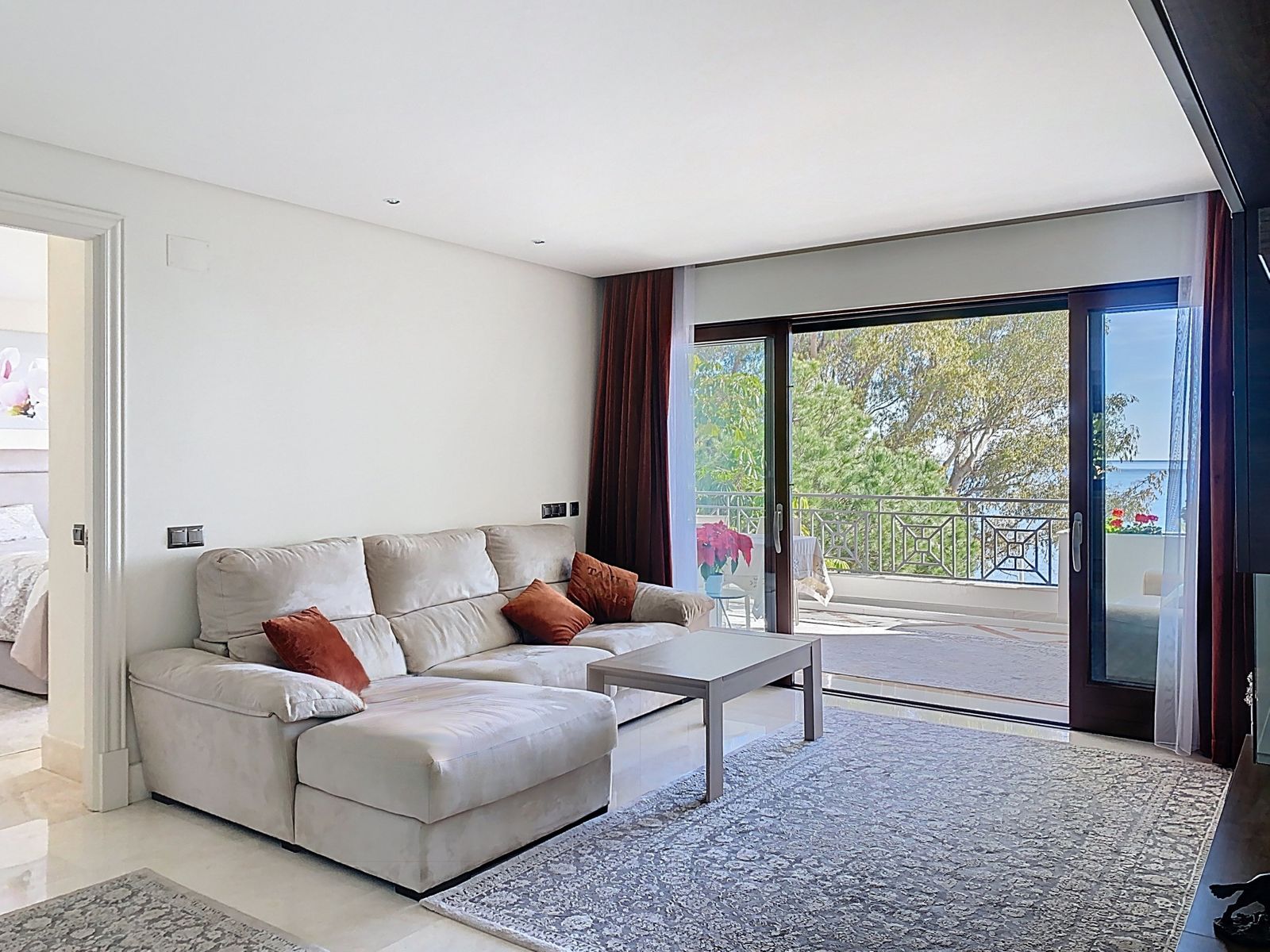 The interior stands out for its high-quality finishes and meticulous construction: acoustic insulation between units, electric shutters, REAL BIANCO cream marble floors, air conditioning, KONNEX home automation system, electric underfloor heating, and large windows that maximize natural light and views. The entire space exudes a sense of timeless elegance and well-being.