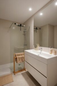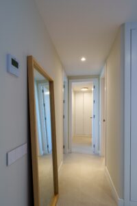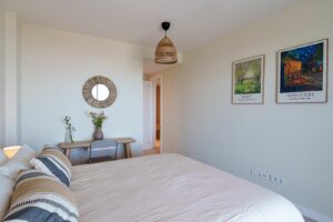 The apartment features two generously sized bedrooms, both filled with natural light and decorated in soothing neutral tones which provides direct access to a private terrace, offering the perfect spot to enjoy your morning coffee or unwind in the evening. The two bathrooms are beautifully designed with contemporary fixtures with underfloor heating