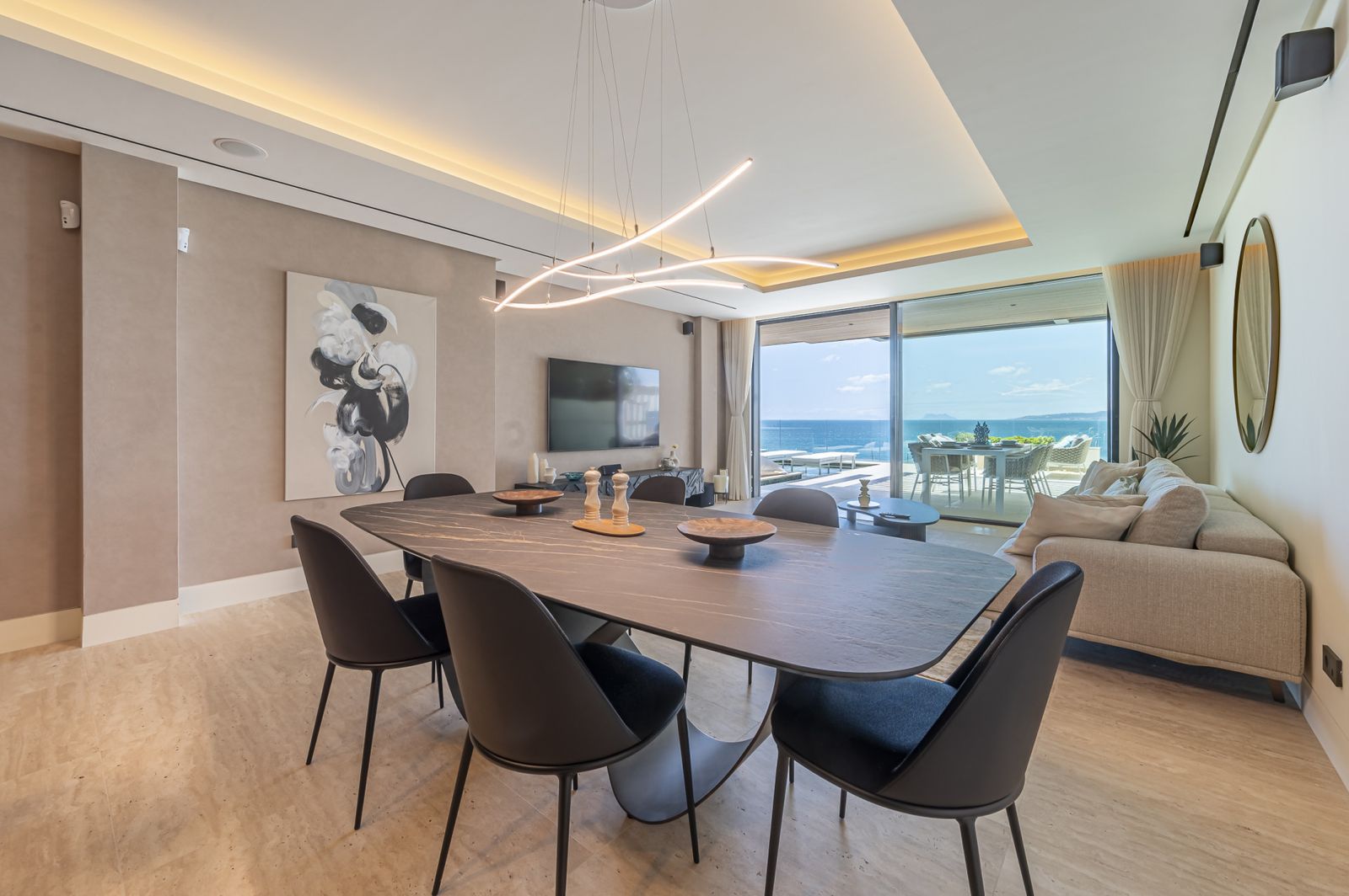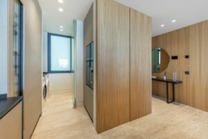 Spanning an impressive 120m² of interior space, the apartment features two generously proportioned bedrooms and two meticulously designed bathrooms. The fully fitted kitchen, equipped with high-end appliances, flows seamlessly into the open-plan dining and living areas, creating a perfect space for entertaining or relaxation. Premium finishes, including marble flooring, double glazing, and glass doors, enhance the sophisticated aesthetic, while the home automation system, central heating, and air conditioning ensure year-round comfort. Additional highlights include a utility room, storage room, and a private garage.