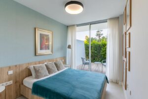 The residence is elegantly furnished and finished to the highest standards, with meticulous attention to detail throughout. The layout comprises a spacious master suite with en-suite bathroom, a guest bedroom, and an additional bathroom. Both bedrooms enjoy direct access to a private rear terrace.