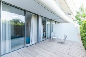 The state-of-the-art kitchen is fully fitted with premium Gaggenau appliances, including a double refrigerator and freezer, and is beautifully integrated into the bright, open-plan living area. Floor-to-ceiling glazing allows the interior spaces to flow effortlessly onto the expansive terrace and private-use garden, offering an exceptional indoor-outdoor living experience.