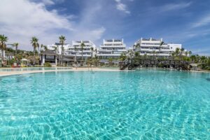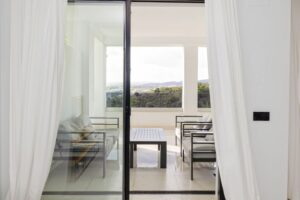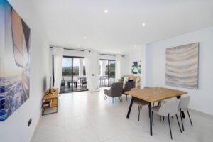 The property features 2 bedrooms and 2 bathrooms, arranged in a bright and spacious layout where every detail has been carefully considered to ensure maximum comfort. The living room, with floor-to-ceiling windows, opens onto a private west-facing terrace that enjoys impressive panoramic views of the Estepona mountain range and stunning sunsets over the Costa del Sol.