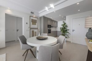A brand new 2-bedroom apartment just steps from the golden sands of the Mediterranean, set within a secure, landscaped resort-style complex. The bright, open-plan living and dining area flows seamlessly onto a generous south-west facing terrace with spectacular sea views, while a cozy fireplace adds warmth and charm.