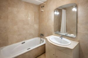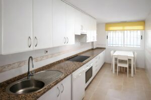 It comprises two bedrooms with built-in wardrobes, including a bright master bedroom with terrace access, as well as two fully fitted bathrooms. The kitchen is separate and fully equipped.