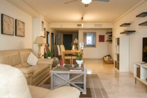 Moving forward, you enter a spacious living room with enough space for both lounge and dining areas. Large windows/sliding doors open onto a generous terrace, offering views over the well-kept communal gardens — a perfect spot for breakfast or to unwind at the end of the day.