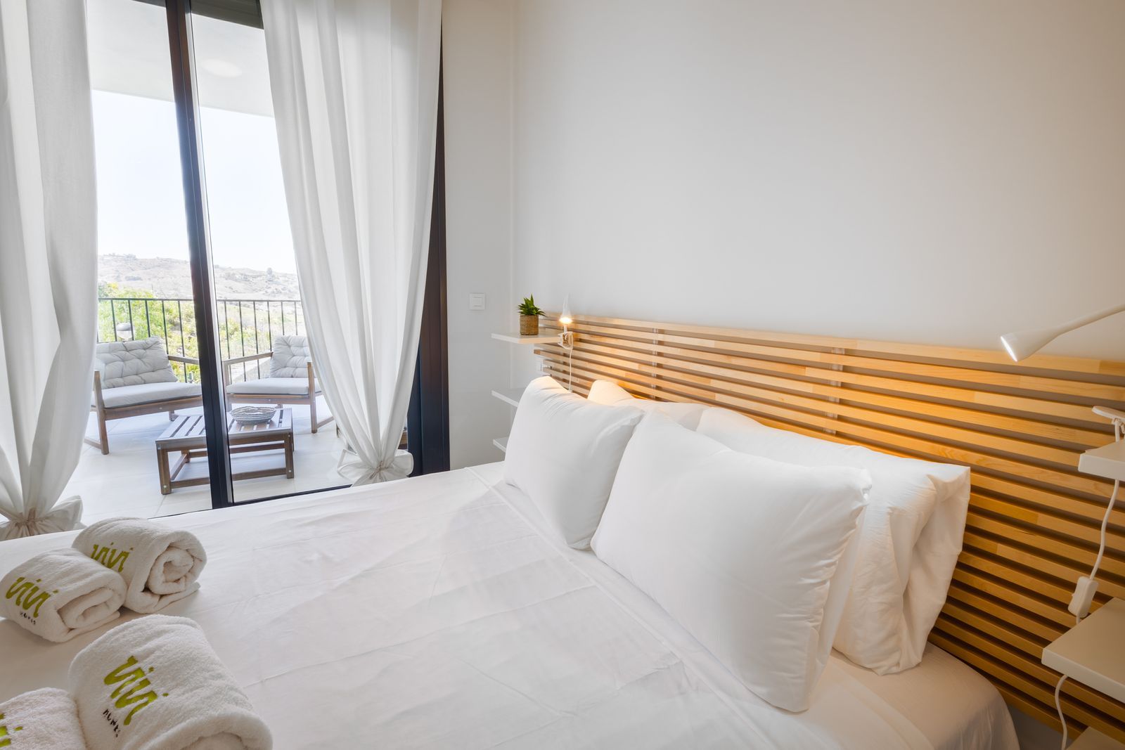 The spacious living room opens onto a large private terrace featuring a dining area and a cozy lounge set—perfect for unwinding after a day exploring the Costa del Sol. From the terrace, a staircase leads down to a beautiful garden where you can enjoy the peaceful surroundings.