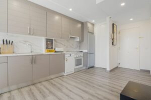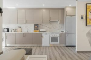 Enter into the open plan living room and kitchen area and feel instantly welcome and at home, this completely renovated and redesigned apartment, makes maximum use of the spacious and bright open plan space. The tasteful interior design and designer furniture are all included as seen, and the property is immaculate, ready for you to move in. The spacious living room is light and bright with double patio doors to the south facing covered terrace over looking the pool and gardens, a lovely place to relax. The large kitchen is fully equipped with lots of countertop and cupboard space, a handy seperate storage area and a large double window giving more light and open views across the La Cala neighbourhood. There is also a built in double cupboard at the entrance.