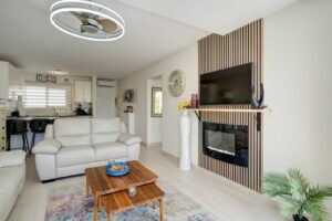 The property has a living room with an integrated kitchen and split air conditioning. The hallway leads to two bedrooms with fitted wardrobes and a full bathroom with a shower. All rooms, including the bathroom, have exterior windows that provide natural light and ventilation.