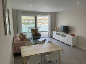 The apartment has 2 double bedrooms and 2 bathrooms one of which is ensuite. Both bedrooms and the lounge area lead out onto the spacious terrace, where you will find a seating area and a dining area. The whole apartment is very well equipped offering a smart TV, hairdryers in both bathrooms, UK plug socket and a safe. The kitchen has everything you will need with modern new appliances.