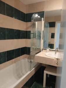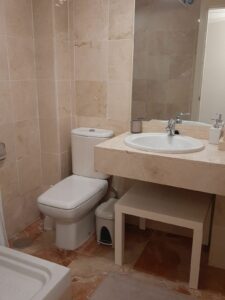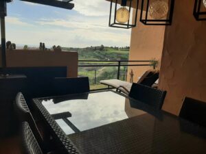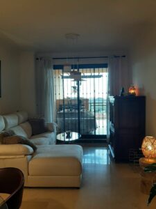 Elevated ground floor apartment with fantastic sea views. 2 beds and 2 baths (one of them en suite) located in the luxurious front line golf urbanization, Calanova Sea Golf. Spacious bedrooms have large built-in wardrobe, there is also a large wardrobe in the wide hallway between the two bedrooms that separates the sleeping area from the kitchen and the living room.