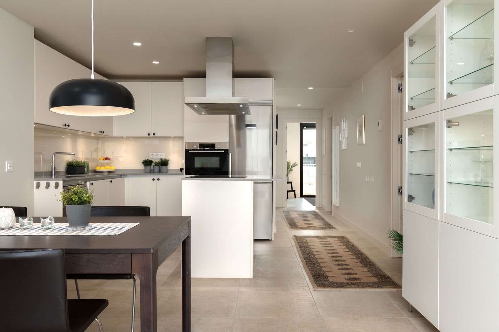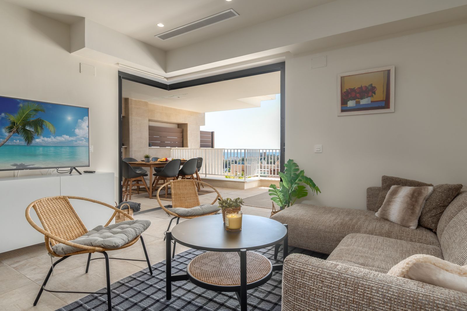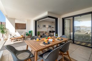 Living room: Spacious and bright with floor-to-ceiling glass doors that open completely onto the terrace. Spacious living and dining room designed for relaxed daily living and entertaining.