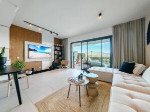 Ground Floor Apartment for sale in , Mijas Costa with 2 bedrooms, 2 bathrooms and with orientation south/east, with communal swimming pool, carport garage (1 parking spaces) and communal garden. Regarding property dimensions, it has 114 m² built and 37 m² terrace. Has the following facilities central heating, fully furnished, fully fitted kitchen, marble floors, jacuzzi, sauna, guest room, gym, double glazing, dining room, security service 24h, private terrace, kitchen equipped, living room, sea view, mountain view, golf view, indoor pool, heated pool, laundry room, 24h service, fitted wardrobes, gated community, close to sea / beach, open plan kitchen, wheelchair-accessible, excellent condition, close to town, surveillance cameras and pets allowed.