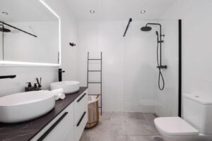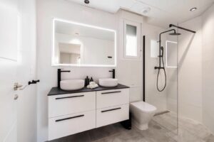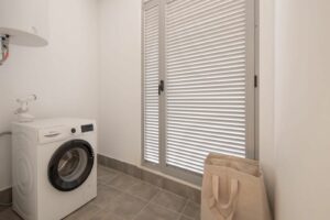 The apartment features two well-proportioned bedrooms, including a serene master bedroom with en-suite bathroom and direct access to the terrace. Both bathrooms showcase a clean, contemporary design with walk-in showers, rainfall fittings, minimalist vanity units, and subtle LED lighting that enhances the modern aesthetic. A dedicated utility and laundry room adds valuable practicality.