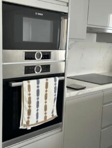 The apartment offers approximately 94 m² built, plus an 11 m² private terrace, and comprises two bedrooms, two bathrooms, an open-plan living and dining area, and a modern fully equipped kitchen. Large windows and direct access to the terrace create a seamless indoor-outdoor living experience with the Mediterranean as a constant backdrop.