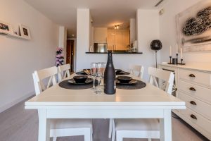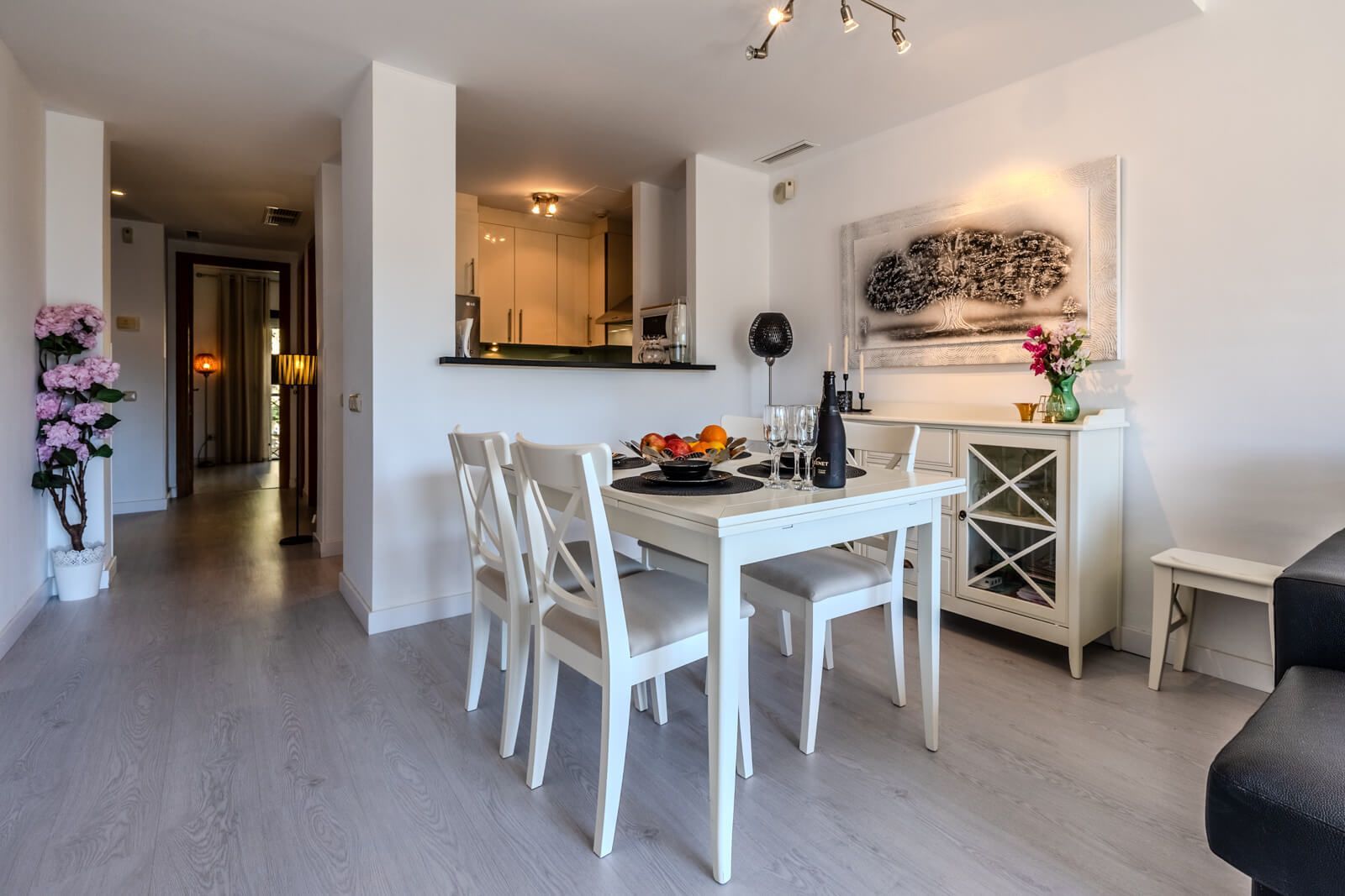 The property has a total size of 100 m² and provides two bedrooms with built-in-wardrobes, hall, living-dining room, 2 bathrooms and an open and fully equipped kitchen, and with underfloor heating in the master bathroom. The apartment has been refreshed including new bathrooms (and new airco).