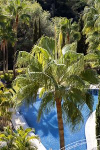 With stunning south-facing sea views, this exquisite property offers a tranquil retreat with its meticulously maintained gardens and two attractive swimming pools. The apartment features two spacious bedrooms, each with an en-suite bathroom, and a master suite that opens to the main terrace.