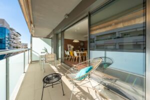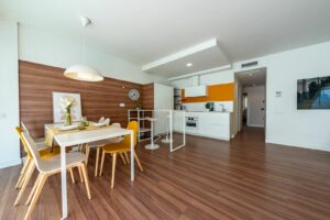The bright and spacious living-dining room incorporates a modern, fully fitted and equipped open-plan kitchen, creating a warm and practical environment for daily living. From this area, there is access to a pleasant 11 m² covered terrace with urban views, ideal for enjoying the Mediterranean climate all year round.