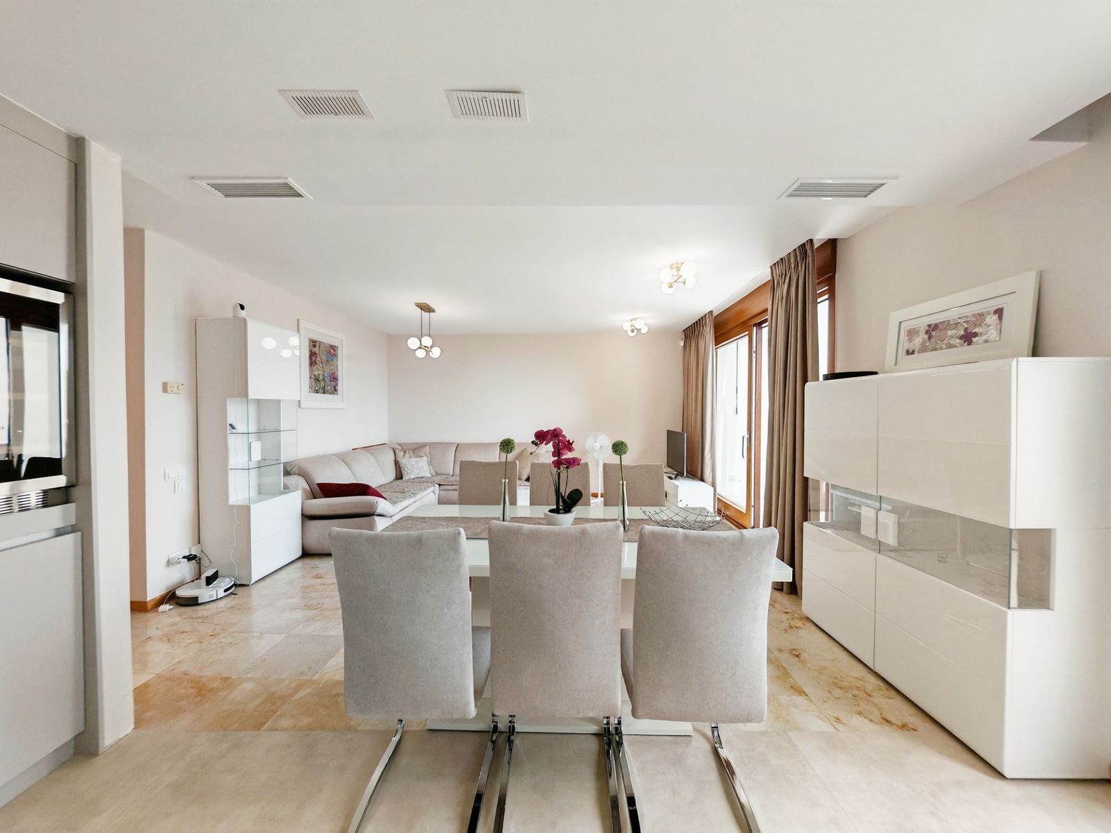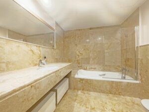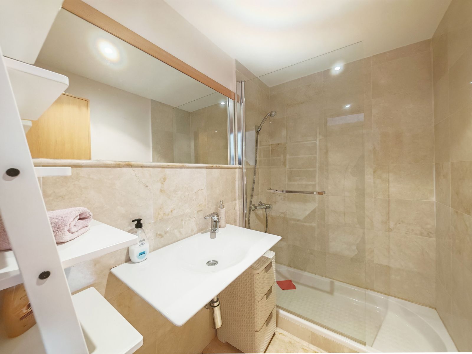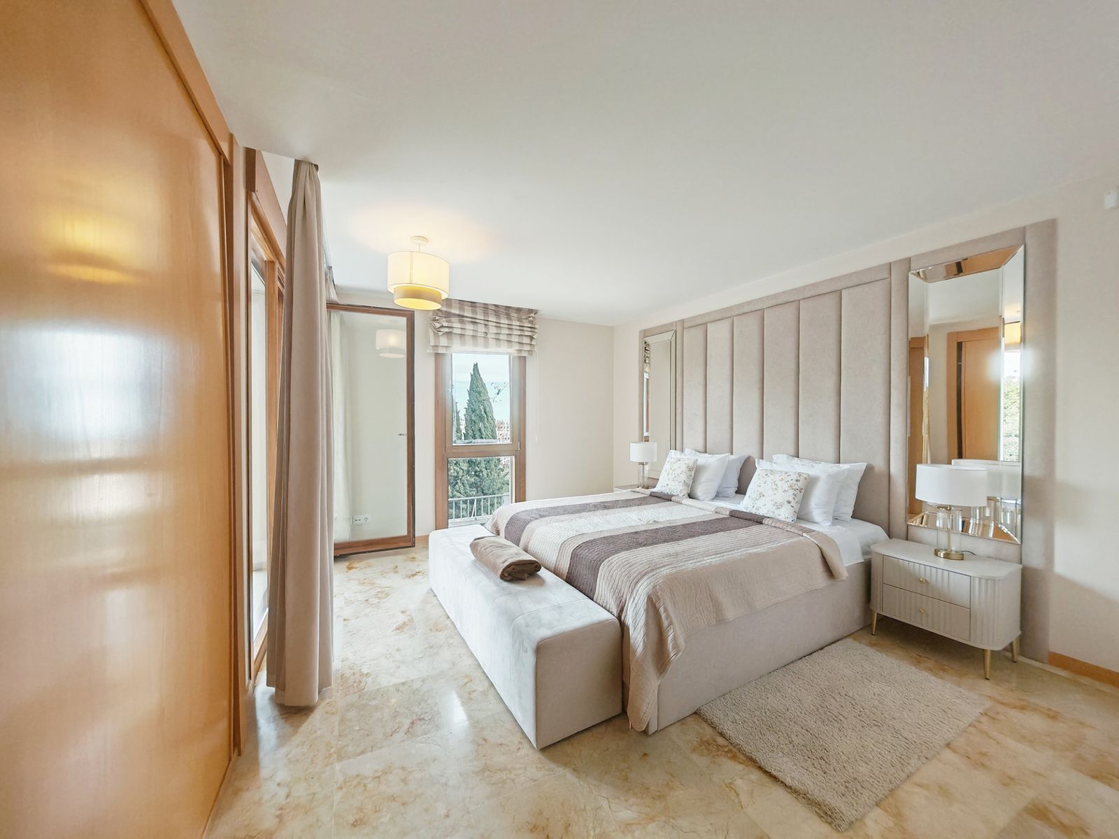 Ground Floor Duplex for sale in Lomas de los Monteros, Marbella with 2 bedrooms, 2 bathrooms, 2 en suite bathrooms, 2 toilets and with orientation south/east, with communal swimming pool, private garage (3 parking spaces) and private garden. Regarding property dimensions, it has 125 m² built, 21.68 m² plot and 26.36 m² terrace. Has the following facilities mountainside, air conditioning, fully furnished, fully fitted kitchen, marble floors, guest room, storage room, security entrance, double glazing, video entrance, guest toilet, living room, sea view, security shutters, covered terrace, electric blinds, fitted wardrobes, panoramic view, underfloor heating (bathrooms), close to children playground, close to golf, uncovered terrace, open plan kitchen, balcony, excellent condition, close to schools and pets allowed.