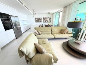 Floor-to-ceiling glass doors open onto the expansive terrace, creating seamless indoor–outdoor living enhanced by the property’s privileged south-facing orientation.