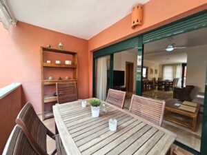 There are 2 large bedrooms and 2 full bathrooms. The master bedroom enjoys an ensuite bathroom with bathtub, while the second bathroom has a shower. Both bathrooms have windows as the apartment is a corner unit, hence the amazing wrap around garden with 3 avocado trees, Nispero tree, lemons trees and a lime tree! The sitting room and dining room have access to both terraces, one overlooking the pool while the other opens up to the extensive private garden with handy direct access to the pool, ideal for families.