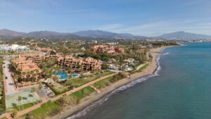 This exceptional two-bedroom garden apartment is situated frontline to the sea within the prestigious Mar Azul Resort, one of Estepona’s most sought-after gated developments. The property enjoys direct access to the beach and is conveniently located within walking distance of local amenities and Estepona Old Town, with Marbella easily accessible.