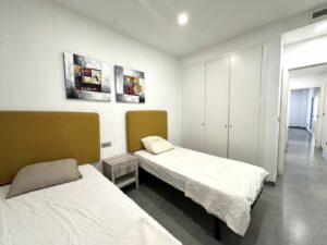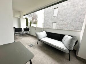 The ground-floor apartment faces southeast and northwest, providing excellent natural light and ventilation throughout the day. It features two bedrooms and two bathrooms, both with built-in wardrobes, as well as central air conditioning for optimal comfort year-round.