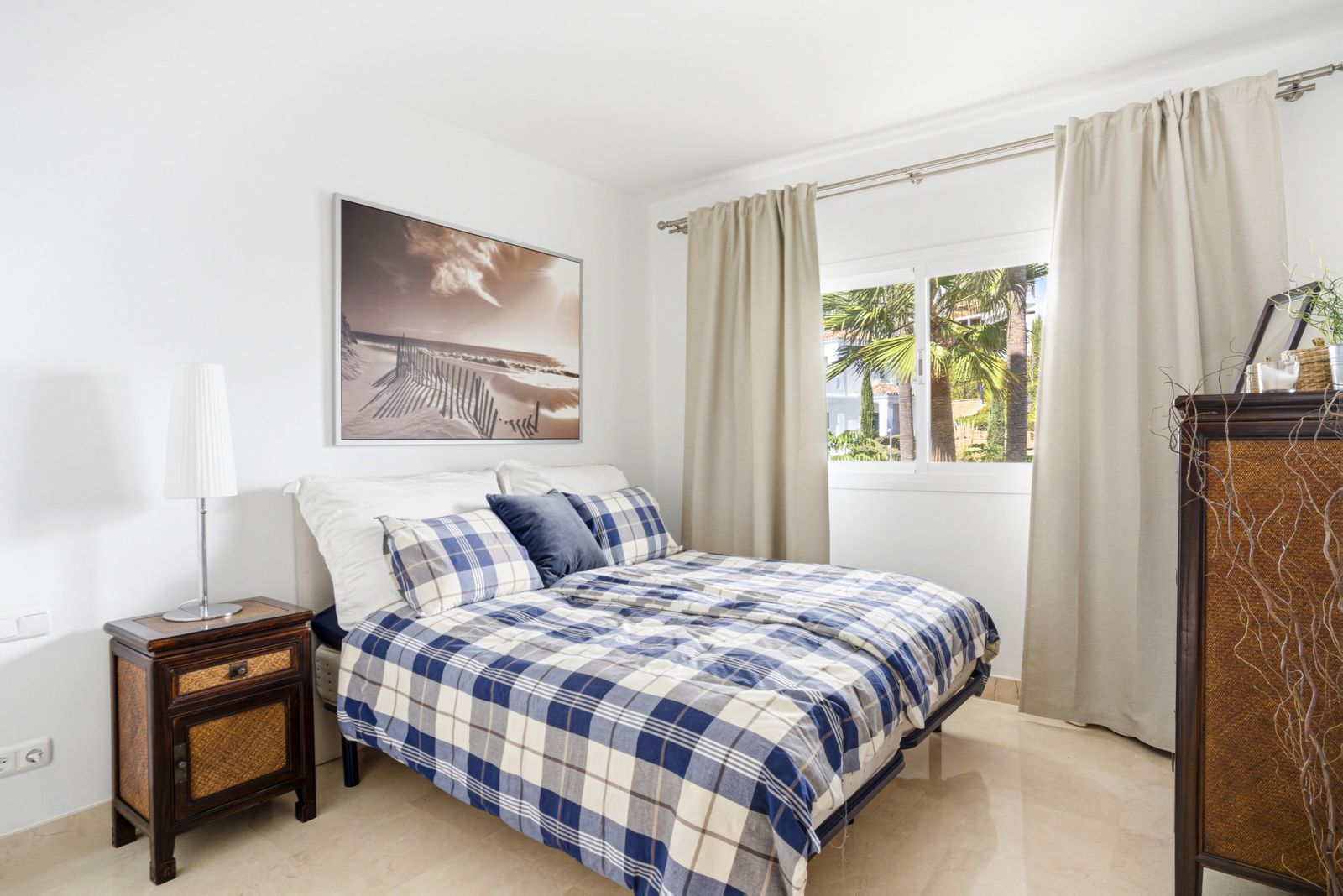 Wonderful two-bedroom, first floor apartment located in the sought-after gated community of Las Tortugas, Nueva Andalucía. Recently renovated and beautifully decorated, this property offers a perfect combination of Andalusian charm and modern comfort. The community boasts a large communal swimming pool surrounded by landscaped gardens with stunning sea views. Located in a tranquil and private setting in the heart of Nueva Andalucía, it is just a short drive to shops, restaurants, international schools, and Puerto Banús. The complex is also surrounded by several renowned golf courses, making it ideal for golf enthusiasts. The property has an open plan living and dining area with access to a spacious south-facing terrace; fully fitted kitchen; master suite with terrace access; guest bedroom; and guest bathroom. Other features include hot and cold air conditioning, marble floors, fitted wardrobes, a private parking space, and a storeroom.