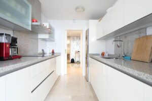 2bedrooms and 2 bathrooms with an L -shaped Living room .It is a corner apartment with lots of light and high