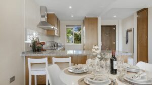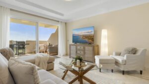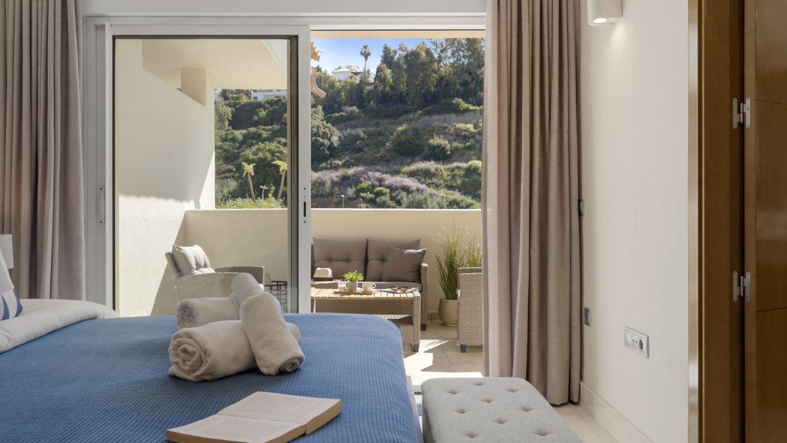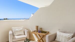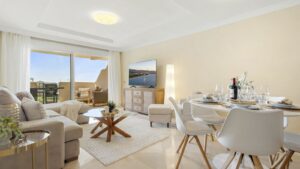 Nestled in the prestigious Aloha Hill Club, this stylish 2-bedroom, 2-bathroom home offers a built size of 124 m² plus 35 m² of terraces, designed to bring in light and capture sweeping sea views. Its southeast orientation ensures brilliant morning light and a warm, welcoming ambiance throughout the day.