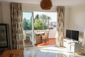 Welcome to this spacious 2 bedroom and 2 bathroom apartment in the well-kept and perfectly situated urbanization of Royal Gardens. The apartment has an open plan kitchen connecting nicely with the living area. The terrace has a dining area with beautiful views of the garden and the mediterranean see. The terrace also has a smaller part for barbeque or relaxing outside the master bedroom. This is the perfect place if you appreciate leaving the car in the garage while walking to the beach, shops or restaurants. In the near surrounding you find some of the best golf courses in the area. The apartment comes with a garage and a storage room which you can reach easily with the elevator. The urbanization is a secure and gated community with 24 h surveillance cameras.