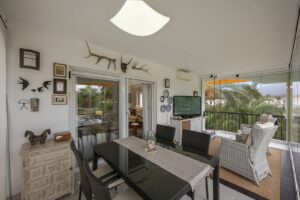 The property offers 2 spacious bedrooms, 2 full bathrooms, a modern fully equipped kitchen, and a large enclosed terrace with Lumon glass and open views, perfect for year-round enjoyment.
