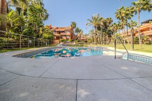 Magnificent ground-floor apartment in the exclusive Embrujo Playa development, one of Marbella’s most sought-after areas thanks to its privileged seaside location and its proximity to Puerto Banús. The property offers two spacious bedrooms and 172 m² of interior living space, featuring generous, comfortable and well-distributed rooms. Its south-facing orientation ensures excellent natural light throughout the day, creating a warm and welcoming atmosphere throughout the home.