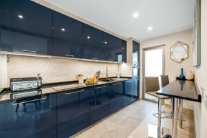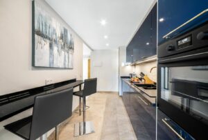 The fully equipped modern kitchen offers sleek cabinetry, quality appliances, and ample storage, making it both practical and stylish. The property comprises two well-proportioned bedrooms with fitted wardrobes, including a comfortable master bedroom. Both bathrooms are modern and finished to a high standard, featuring walk-in showers and elegant contemporary fittings.