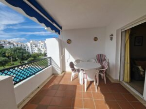 Located in one of the best blocks within the complex, the property consists of 2 bedrooms, 2 bathrooms, kitchen, laundry room and a beautiful terrace overlooking the communal gardens and swimming pools. From the terrace you can see the sea.