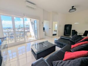 The living space is open and full of natural light, with high ceilings and a seamless connection to the terrace – perfect for relaxed Mediterranean living. The kitchen offers direct marina views, and both bedrooms are well-appointed, with the master including an en-suite and the second bedroom looking straight out over the harbour.