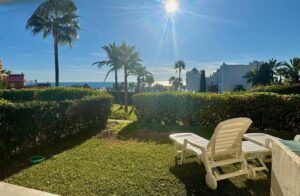 This bright and airy corner apartment offers excellent potential for modernisation and enjoys impressive sea views. A spacious terrace, accessible from both the living room and main bedroom, flows directly into a private garden area, creating a tranquil and secluded outdoor space.